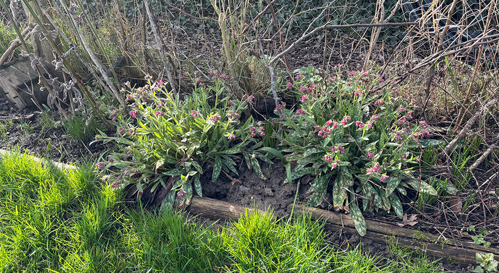 The pulmonaria are flowering very nicely and there are a couple of tiny snowbells at the end of the bed.