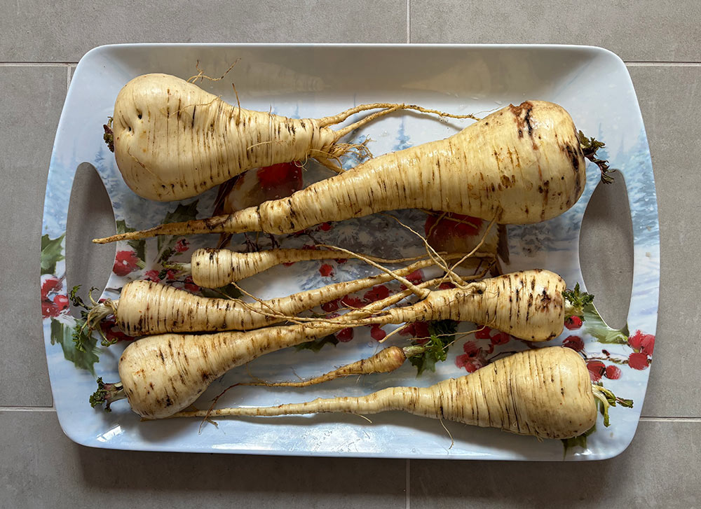 The remaining parsnips have started regrowing their tops. I dug up what I could fit in my bag / comfortably carry, which included a couple of very big ones. The rest will be much smaller and it will probably be possible to bring them all home at once.